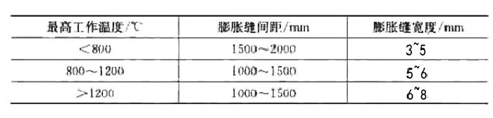 ②現(xiàn)場(chǎng)澆注的爐體。現(xiàn)場(chǎng)澆注的耐火澆注料爐體留設(shè)膨脹縫的間距和寬度。可參考表1所示。表中數(shù)值適用于黏土質(zhì)和高鋁質(zhì)耐火澆注料。
